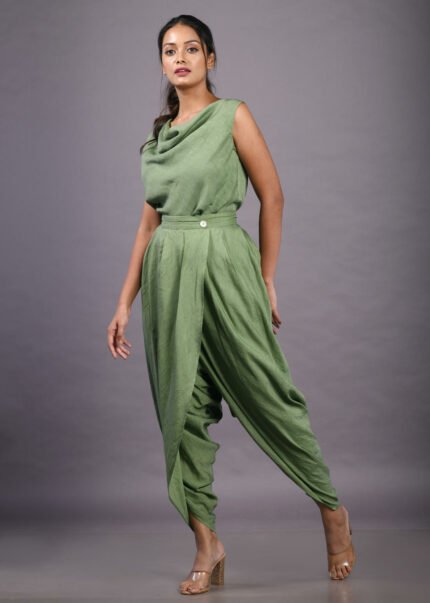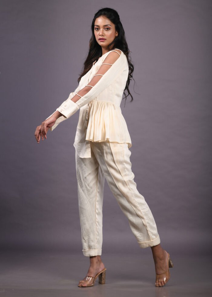 This beige co-ord with an asymmetrical hemline is uniquely designed to pose an excellent finish. The top has a V-neck and pleated Pattern below the waist and is fastened with left-aligned buttons. The use of South silk, joined fringes on the sleeves and cream-white shades add tasteful style to the attire. It is fastened at the waist and wrist to fabulously embrace your body structure.