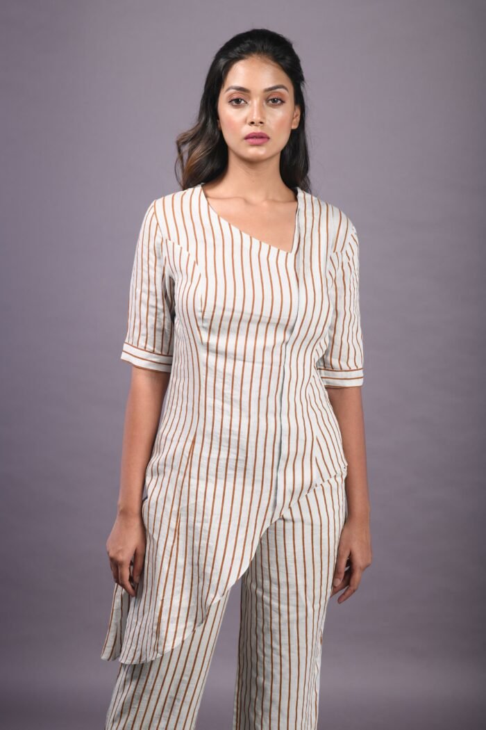 This versatile set of co-ords upholds an unconventional blend of stripes and asymmetry. It consists of a quarter-sleeved top with asymmetrical hem and necklines and ankle-length trousers, made of linen georgette. It harmonizes the use of brown stripes on a lighter shade of gray solid surface. The screen-printed ornamentation offers a tasteful touch to the outfit.