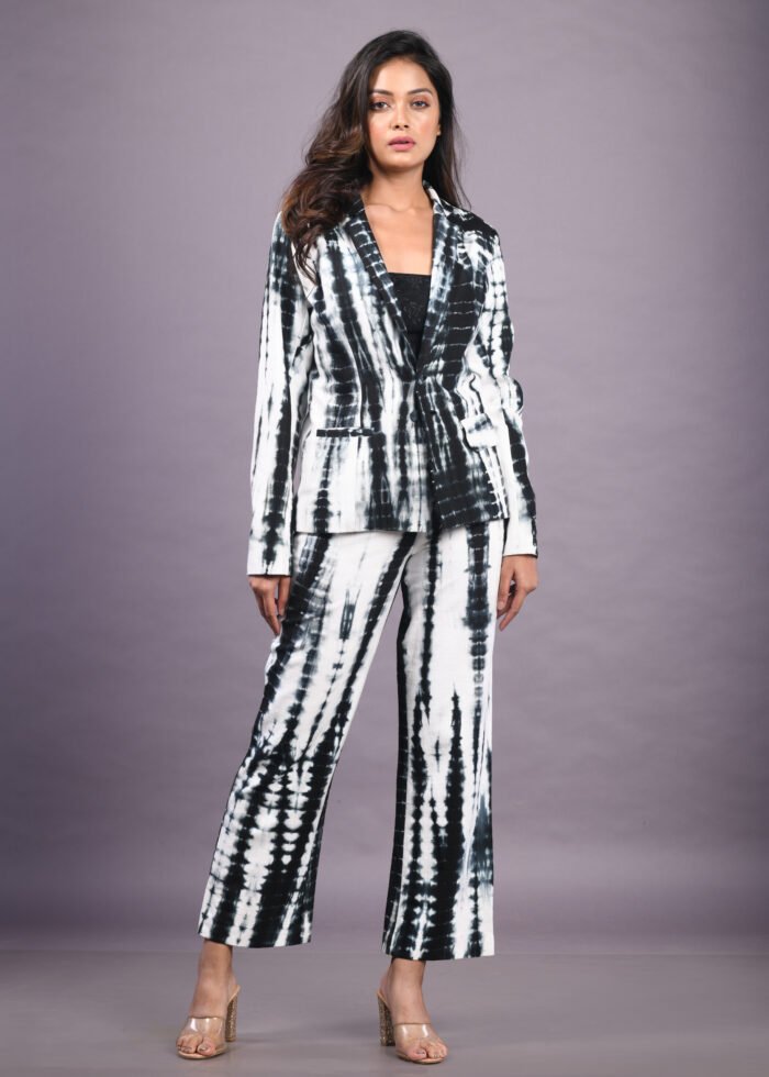 This gorgeous tie-and-dye set of a full-sleeved jacket and trousers is a unique piece capable of making heads turn. This outfit is purely made of hand woven Cambric cotton in black and white splashes. The bond pockets and button fastening gives the wearer a formal, yet ravishing look. This jacket and the trousers are versatile enough to complement any outfit like tops, tunics, jeans and many more.