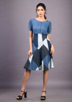 The Denim midi dress with distinct patchwork is a must-have for semi-casual occasions. This knee-length A-line dress with short, puffed sleeves adds feminine charm to the attire. The elegant shades of blue, pearl shell buttons and mild touches of lighter colours make it a tasteful must-have for your wardrobe.