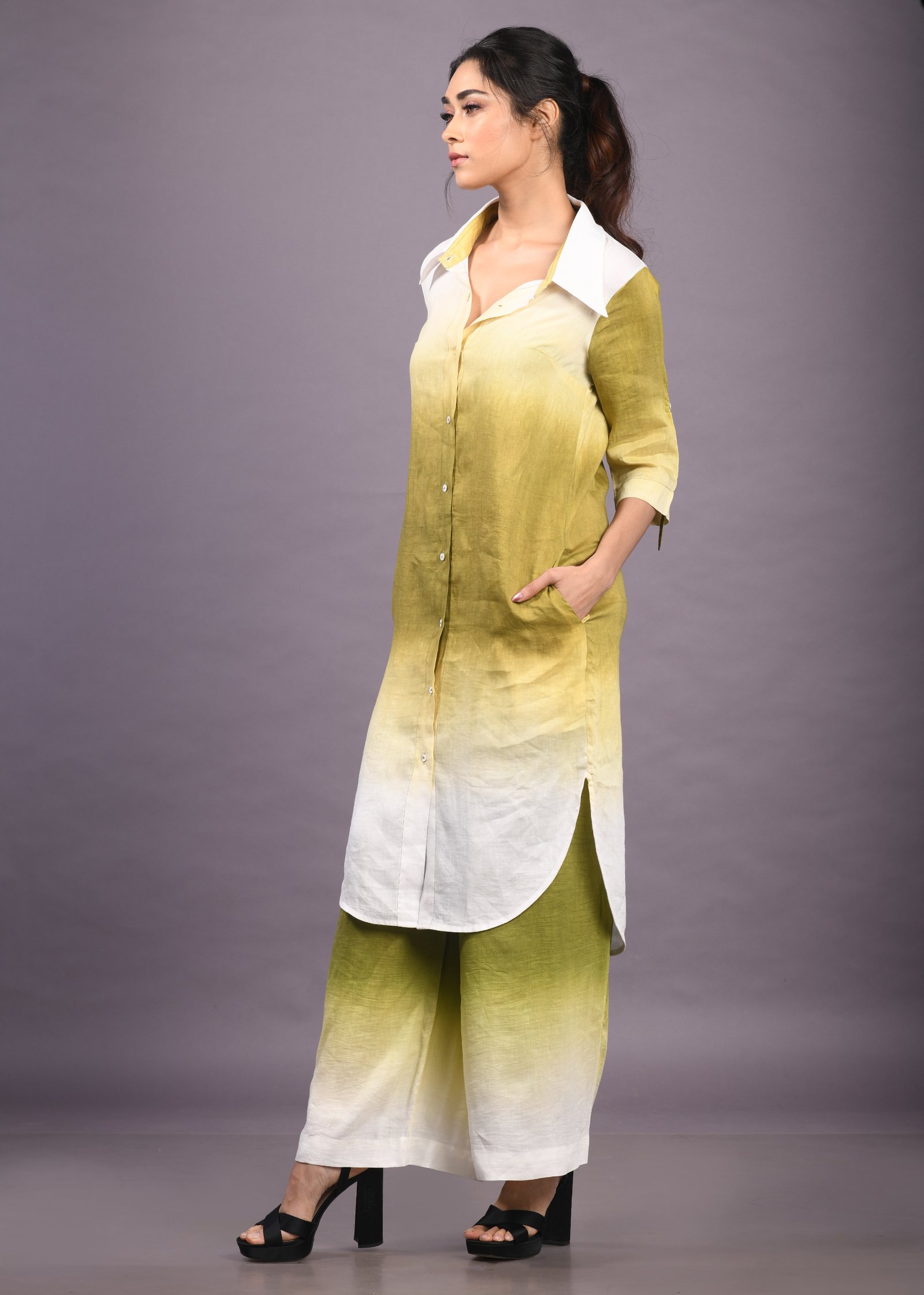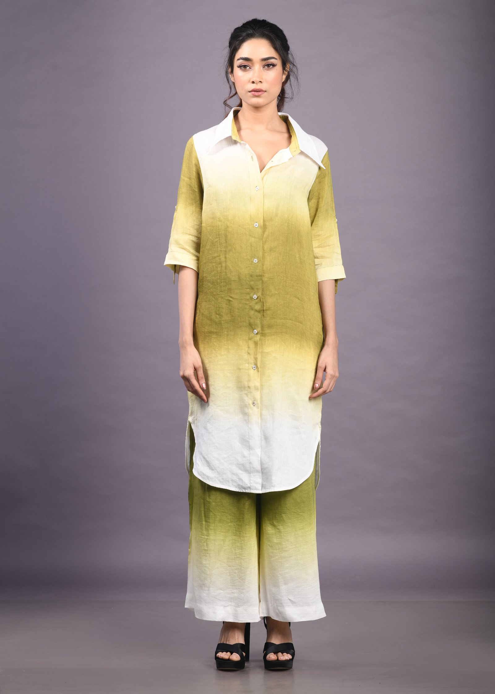 The gorgeous harmony of green, white and beige ombre is the soul of this outfit. The set comprises a long shirt with pockets on both sides and ankle-length trousers.