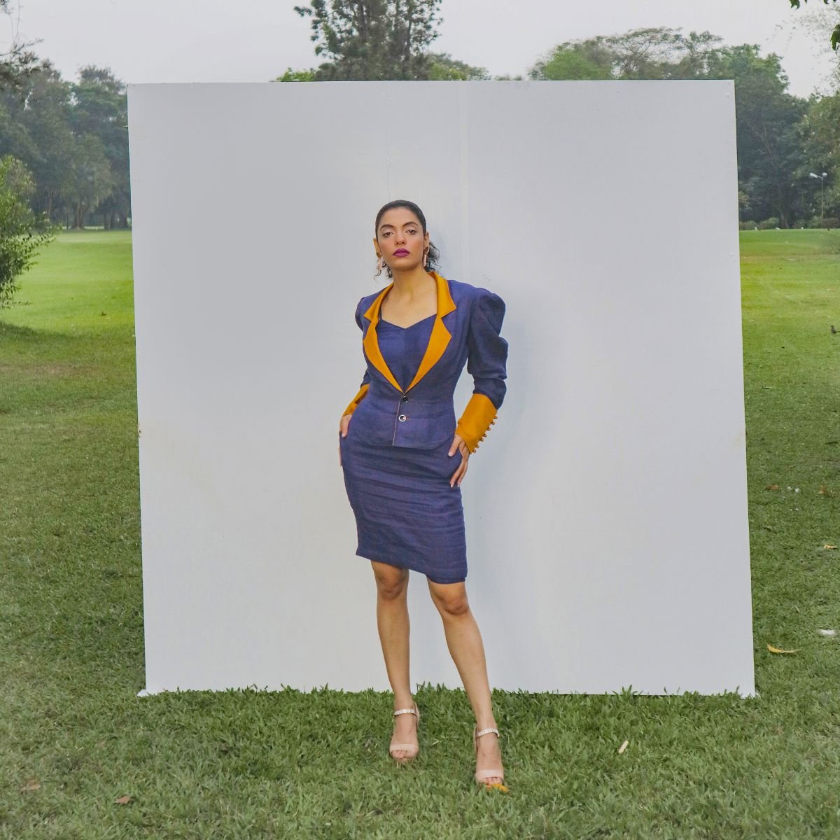 blue jacket with a ruffle sleeve, well-crafted lapels and