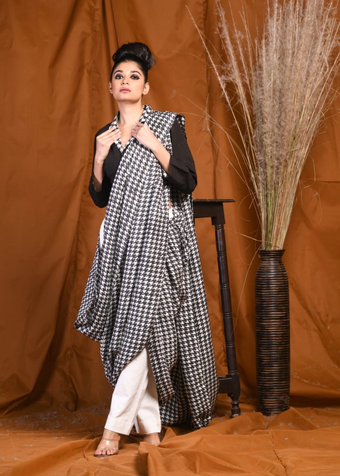 SKU: N/A Category: Co-Ords Tags: Black, co-ord, Houndstooth, Pantsaree, saree, set, white